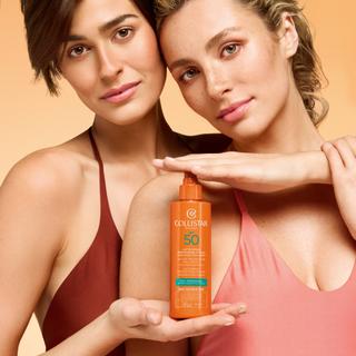 The moisturizing bronzing spray SPF 50 absorbs quickly and combines ease of application with a formula specifically designed for sensitive skin. The hyper-fermented prickly pear extract provides exceptional moisturizing, antioxidant, and soothing properties, while a special hop extract, rich in antibacterial polyphenols, offers a sense of total well-being. Suitable for all skin types, including use by children under 3 years.