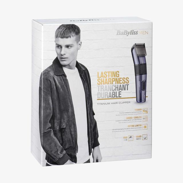 The BaByliss Titanium hair clipper is a stylish razor that can be used with mains power or battery and features a titanium blade for superior cutting performance. This combination ensures precise cutting and trimming for professional results. The blade is removable and washable, making cleaning and maintenance easy. With an impressive battery life of 60 minutes, it offers maximum flexibility and mobility while cutting hair. The 360° rotating wheel allows you to easily adjust 26 cutting lengths from 0.5 mm to 25 mm. The hair clipper also comes with a handy beard comb accessory, offering versatile styling options.