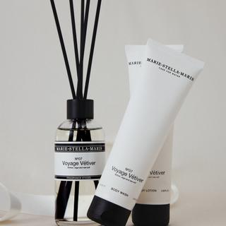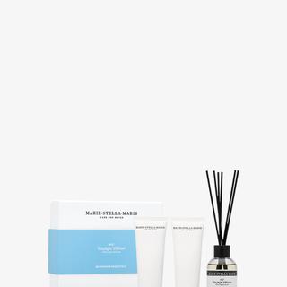 Indulge in a luxurious pampering experience with our bathroom essentials set. It includes a reed diffuser, a bubble bath, and a body lotion. The natural bubble bath gently cleanses while the body lotion intensely hydrates, creating a refined olfactory experience with notes of vetiver, sage, and sea salt.