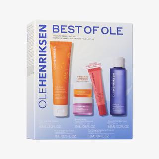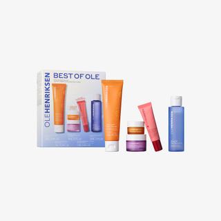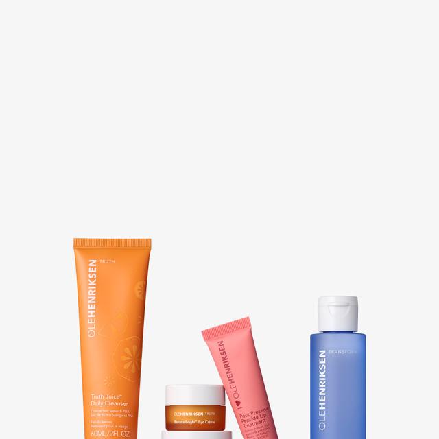 This daily skincare routine features five bestselling products from OleHenriksen for smooth, even-looking, hydrated, and elastic skin. Truth Juice Daily Cleanser removes dirt, excess oil, and long-wear makeup while revitalizing the skin. Glow2OH Toner visibly reduces dark spots. Strength Trainer Peptide Boost Moisturizer strengthens the skin's barrier and hydrates the skin. Banana Bright+ Eye Crème instantly brightens the eye area. Pout Preserve Peptide Lip Treatment fills lips with hydration. Reflective banana pigments make the complexion appear brighter and more radiant. Polyhydroxy acid (PHA) helps to dissolve and remove dead skin cells to reveal fresher skin underneath. Peptides nourish and support strong skin.