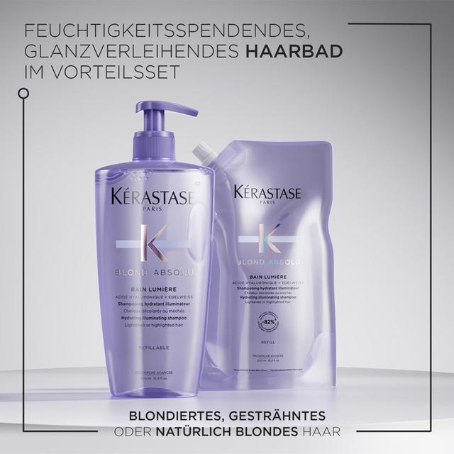 Rechargeable dispenser bottle Blond Absolu Bain Lumiere and refillable packaging for blonde or bleached hair. This kit provides optimal care for blonde hair, helping to maintain its shine and vitality.