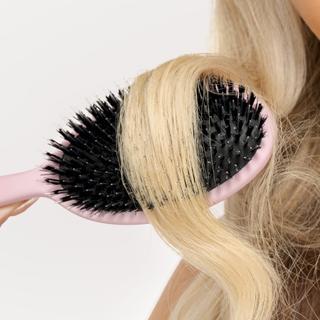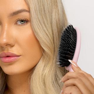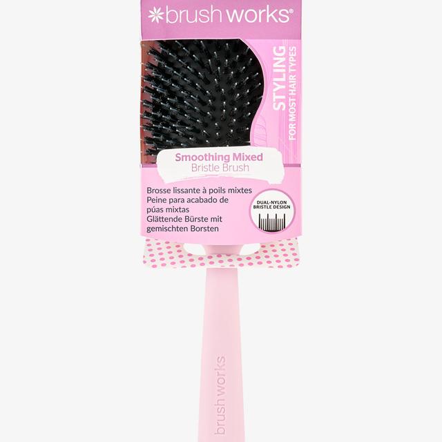 The Brushworks hair brush is designed to smooth and detangle hair with every use. Its innovative design features flexible nylon tips that glide through knots while gently massaging the scalp, combined with dense bristles that help achieve a smooth and shiny finish. Suitable for all hair types, it is perfect for daily use and leaves hair shiny and easy to style. PETA certified, not tested on animals, and vegan.