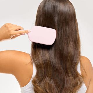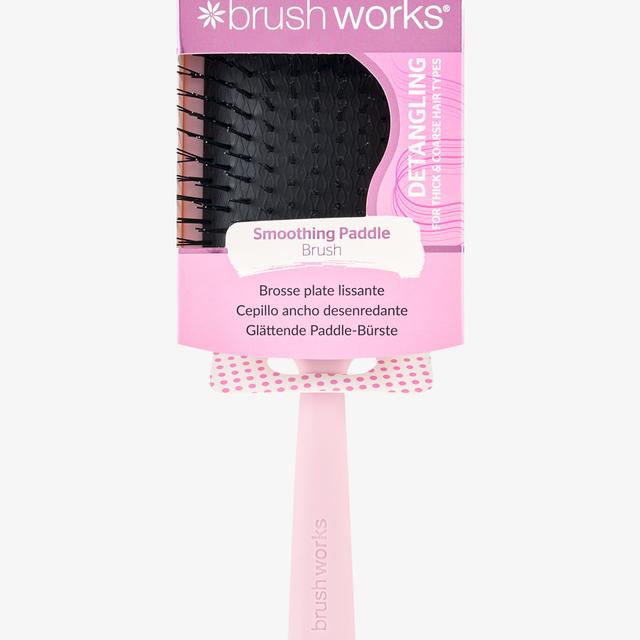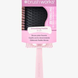 The Brushworks Smoothing Paddle Hair Brush is designed to detangle and smooth hair in one simple step. Featuring densely arranged nylon bristles of varying lengths, it glides through knots reaching the scalp to provide a gentle massaging sensation. Ideal for long, thick hair, it helps leave hair looking smooth and shiny with every use, making it a practical choice for achieving a sleek, professional finish at home. The brush is made with 66% recycled materials and is PETA approved, cruelty-free, and vegan-friendly.