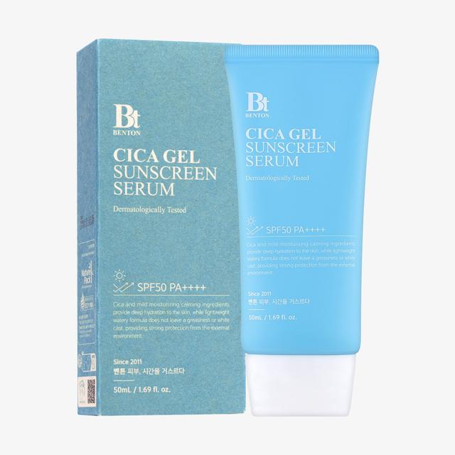 This CICA GEL sunscreen cream with SPF 50 PA++++ is enriched with soothing ingredients and is perfect for daily use. It contains centella asiatica, ideal for soothing irritations and stimulating repair for sensitive skin, along with hyaluronic acid and panthenol for deep hydration. Its lightweight texture leaves no white residue and absorbs quickly without weighing down the skin.