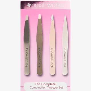 The gold combination tweezers set from Brushworks HD is handcrafted from high-quality stainless steel, offering exceptional performance and precision. It includes angled, straight, slanted-tip, and pointed tweezers, perfect for eyebrow care, false eyelash application, and removing ingrown hairs. PETA certified, cruelty-free, and vegan.