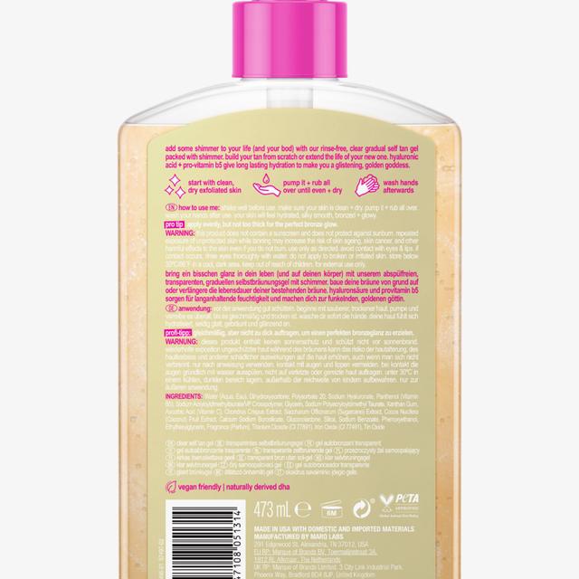 A transparent self-tanner, transfer-resistant, with golden shimmer for a sun-kissed glow. Pro-vitamin B5 and hyaluronic acid ensure smooth, radiant skin.