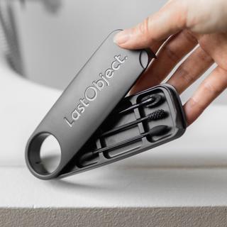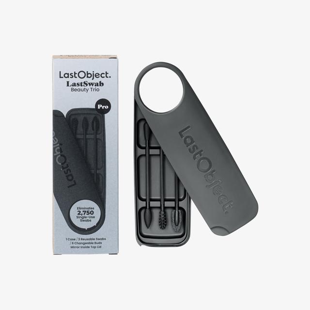 LastSwab Beauty Trio Pro is a makeup tool kit that includes items for removing makeup, blending, correcting mistakes, separating lashes, and shaping eyebrows. The kit comes with a container featuring a large mirror.