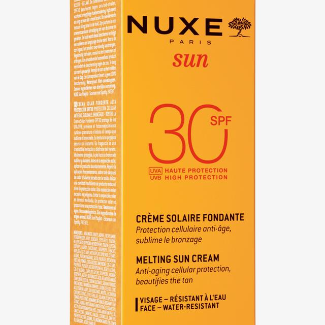 The Sun Delicious Cream High Protection SPF 30 by Nuxe offers anti-aging protection and gives a wonderful tan. It has been specifically developed for the delicate skin of the face, penetrating easily without leaving white residues. Its fragrance is characterized by notes of sweet orange, tiaré flowers, and vanilla.