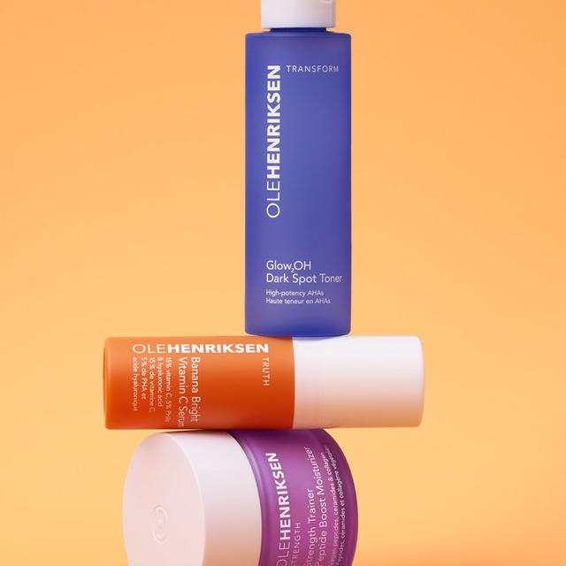 The Ole Glow Skincare Set is a bestselling anti-aging routine featuring vitamin C, chemical peels, and peptides to combat visible signs of skin aging. This effective 3-step routine addresses main signs of aging: dullness, uneven texture, and dryness. It includes a brightening toner with AHA that smooths texture and reduces dark spots, a powerful vitamin C serum, and a moisturizing cream that enhances skin elasticity.