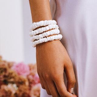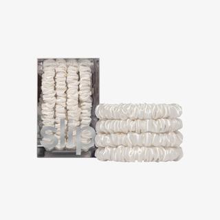 Includes: 4 thin hair scrunchies made of pure white silk. Designed to be crease-free and break-free, made with slipsilk to protect your delicate hair. Elevate your hair accessory game with these innovative elastics.