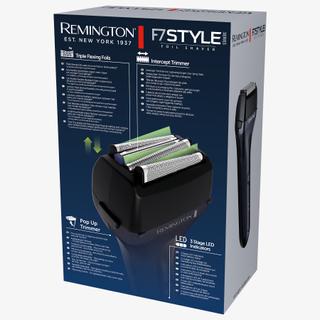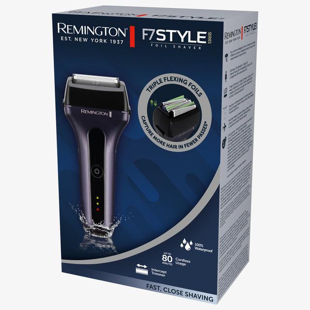 The Remington F7000 Style Series F7 electric razor with tri Flex foil captures more hair with fewer passes, while the InterceptTrimmer captures longer and deeper hairs for detailed styling. This device is 100% waterproof and features benefits such as voltage adjustment for all countries and USB-C charging.