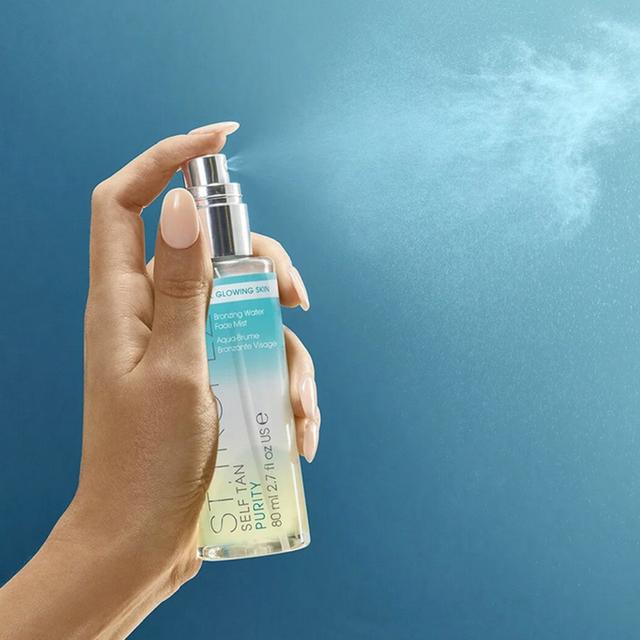 The Self Tan Purity Bronzing Water Face Mist is a revitalizing spray designed to help tanning ingredients adhere to the skin while protecting it from environmental damage. Formulated with natural DHA, mandarin water, and lotus flower extract, it helps prevent skin aging. Hyaluronic acid supports the skin, providing a fresh and rested appearance. This lightweight, colorless mist ensures a natural-looking golden tan for 4-8 hours, lasting for days and easily refreshable. It can be used as a primer, makeup revitalizer, or a relaxing spray on clean skin.
