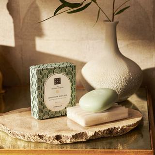 Create a new routine and save the packaging with our The Ritual of Jing Clean Beauty Bar. This soap-free bar is made with 91% natural ingredients and removes impurities and excess oil. It refreshes and tones the skin and hair, enveloping them in a wonderful fragrance. Its gentle cleansing properties are suitable for sensitive skin. Unlike regular solid soaps, it does not strip the skin of its natural fats and does not dry it out, leaving it clean and incredibly soft. Enriched with the relaxing fragrance of jujube and lotus flowers, it is perfect for daily use. Experience perfect cleansing and lasting beauty with our Rituals Clean Beauty Bar.