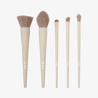 The SO ECO brush set includes five high-quality brushes to achieve flawless makeup. It features an ultra-soft powder brush for perfect contouring, a flat-tipped foundation brush for applying a flawless base, and three essential eye brushes for applying, defining, and blending pigments. All brushes are environmentally friendly, cruelty-free, PETA certified, and vegan.