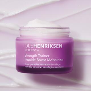 Strength Trainer Peptide Boost Moisturizer is a daily moisturizing cream rich in peptides, collagen, and hyaluronic acid, clinically tested to double hydration, increase elasticity, and improve the appearance of fine lines and wrinkles. This reinforcing moisturizer deeply hydrates and helps the skin retain moisture throughout the day. It contains powerful ingredients like amino acids, peptides, ceramides, and collagen to restore hydration and firmness for all skin types, including sensitive skin.