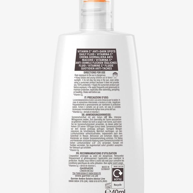 The Garnier Ambre Solaire Super UV solar fluid with vitamin C, with SPF 50+, protects the skin from harmful UVA and UVB rays and reduces dark spots. This product is perfect for those seeking effective sun protection.