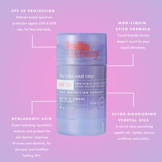The Take-Out One - Invisiblesun Stick SPF 30 is a versatile sunscreen stick that is easy to use even when you are out of the house. The invisible formula makes application particularly quick and simple, as it leaves no residue that needs to be massaged in. Formulated with an SPF 30 filter, the stick offers broad-spectrum protection against UVA and UVB rays, and thanks to hyaluronic acid and a blend of nourishing oils, it also has moisturizing properties. Lime, geranium, and mint leave a delightful scent on the skin and provide a feeling of freshness.