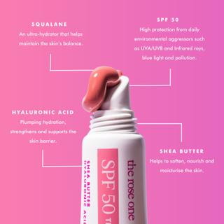 This tinted and moisturizing lip balm offers SPF 50 protection. Enriched with shea butter and hyaluronic acid, this soft and berry-scented formula coats the lips in a nourishing color all day long. Repeated use keeps lips protected, soft, and hydrated.